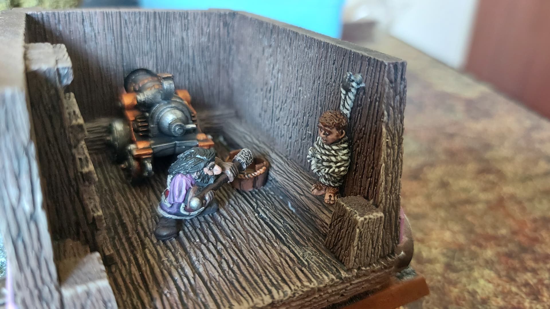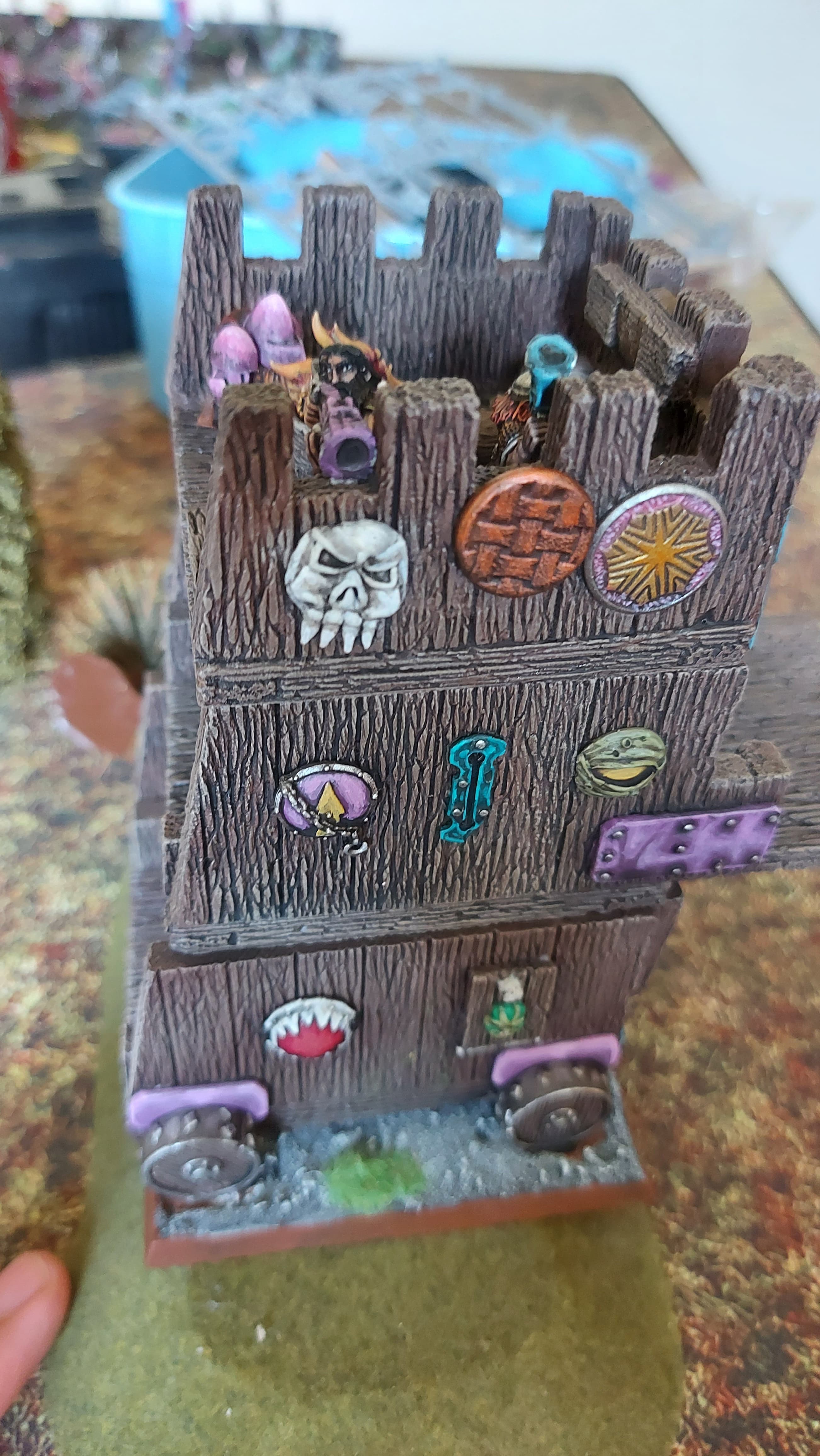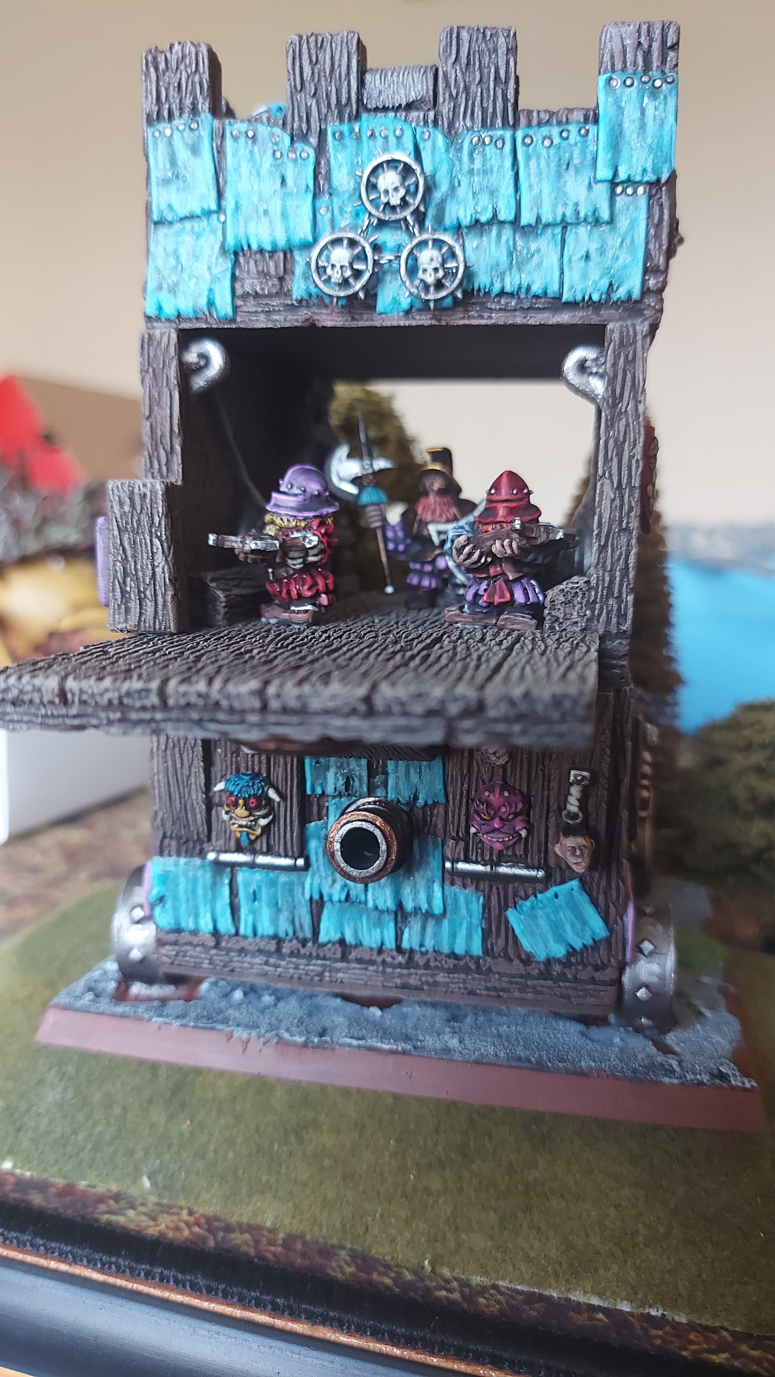 Next we have my 2nd siege tower/juggernaught from scotia grendel. With a cannon crew member donated by zanko watched by his halfling captive on the 1st floor the dwarf cannon was extended to fit through a stressful drilled hole haha!
