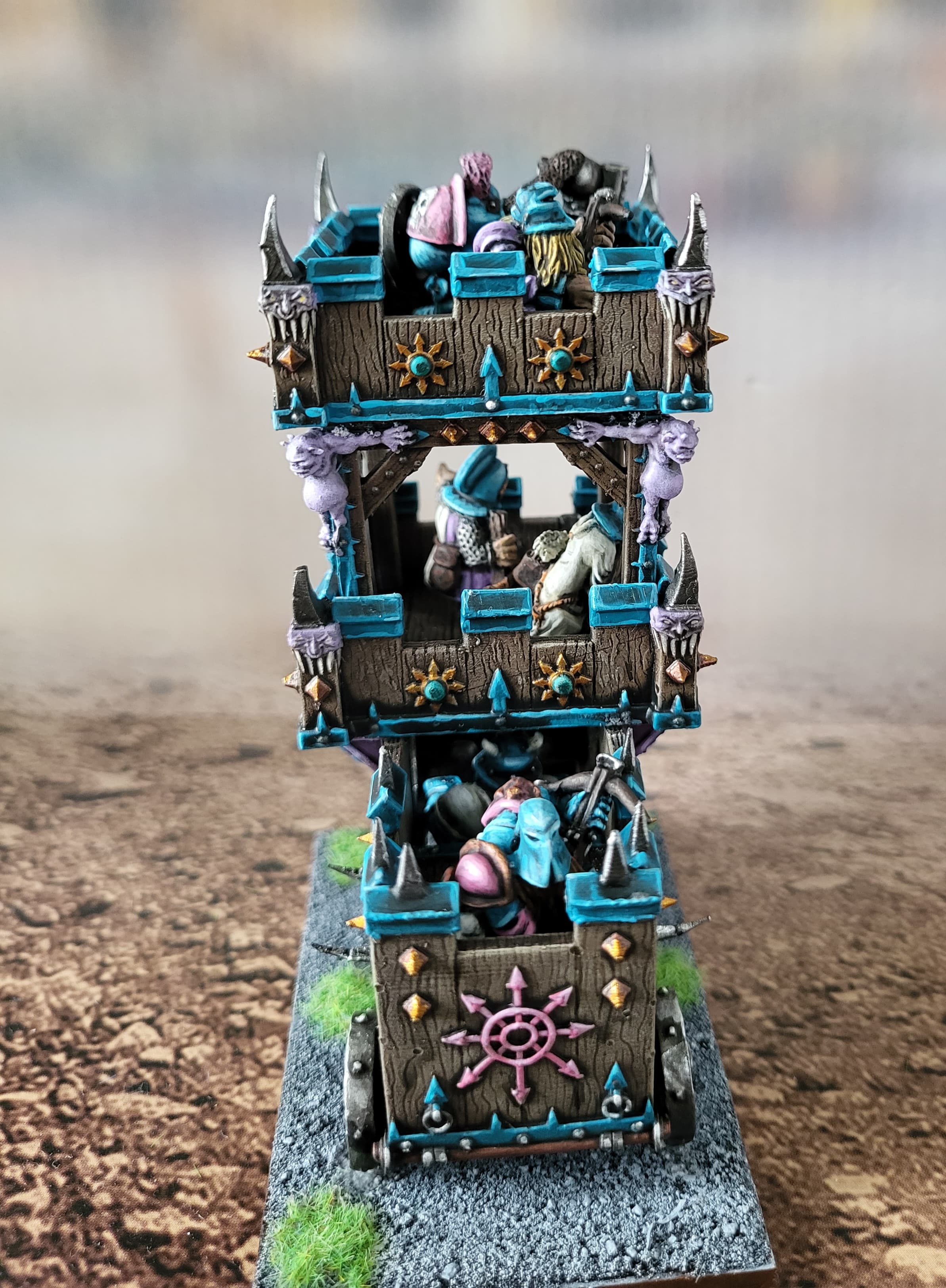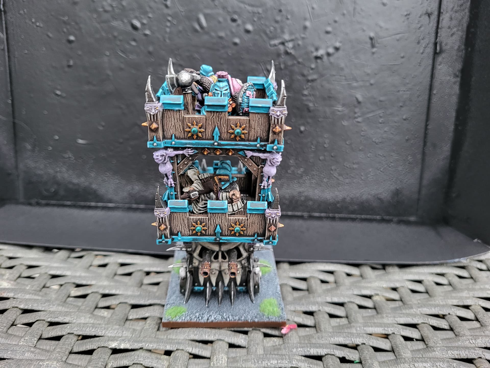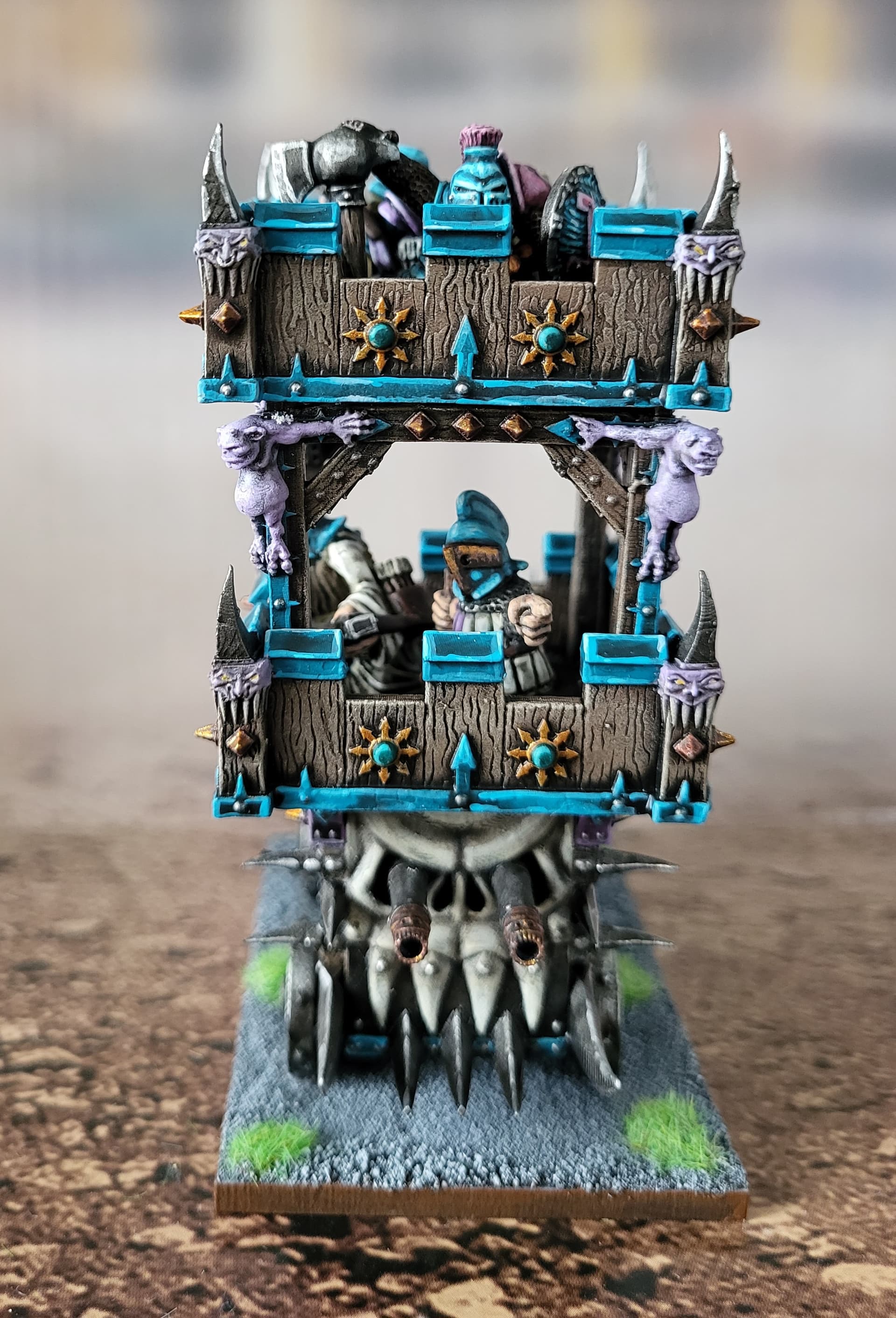I think there were 2 options for wheels and the sculptor recommended the larger ones. The little square holes in the top level didn’t quite line up to the underlying supports. Getting the centaur in meant i had to paint it separately then squeeze it through the bottom of the juggernaut. I removed thd tab from its feet and glued it and the juggernaut to the base at the same time, while holding them from the top. A bit stressful!