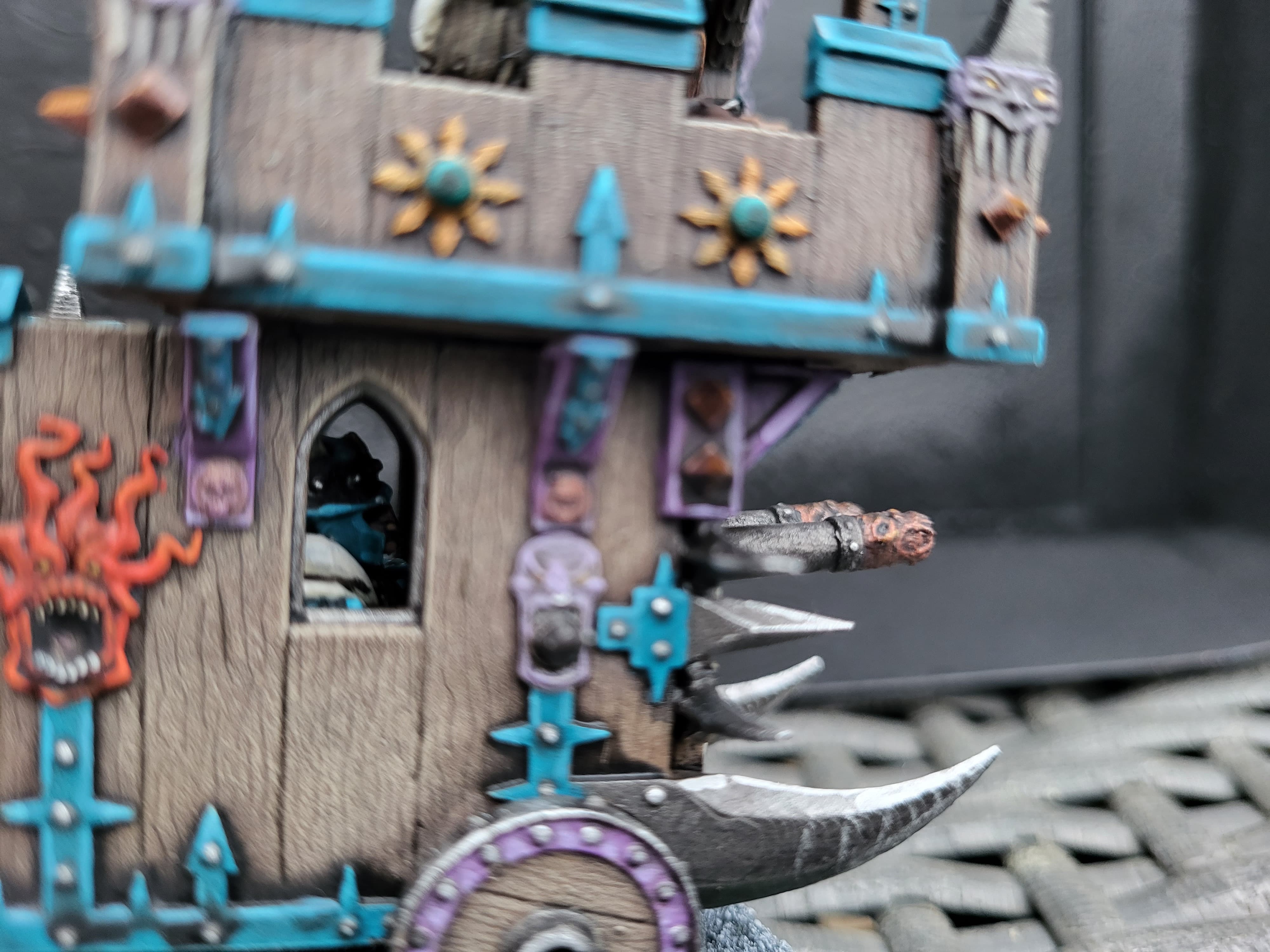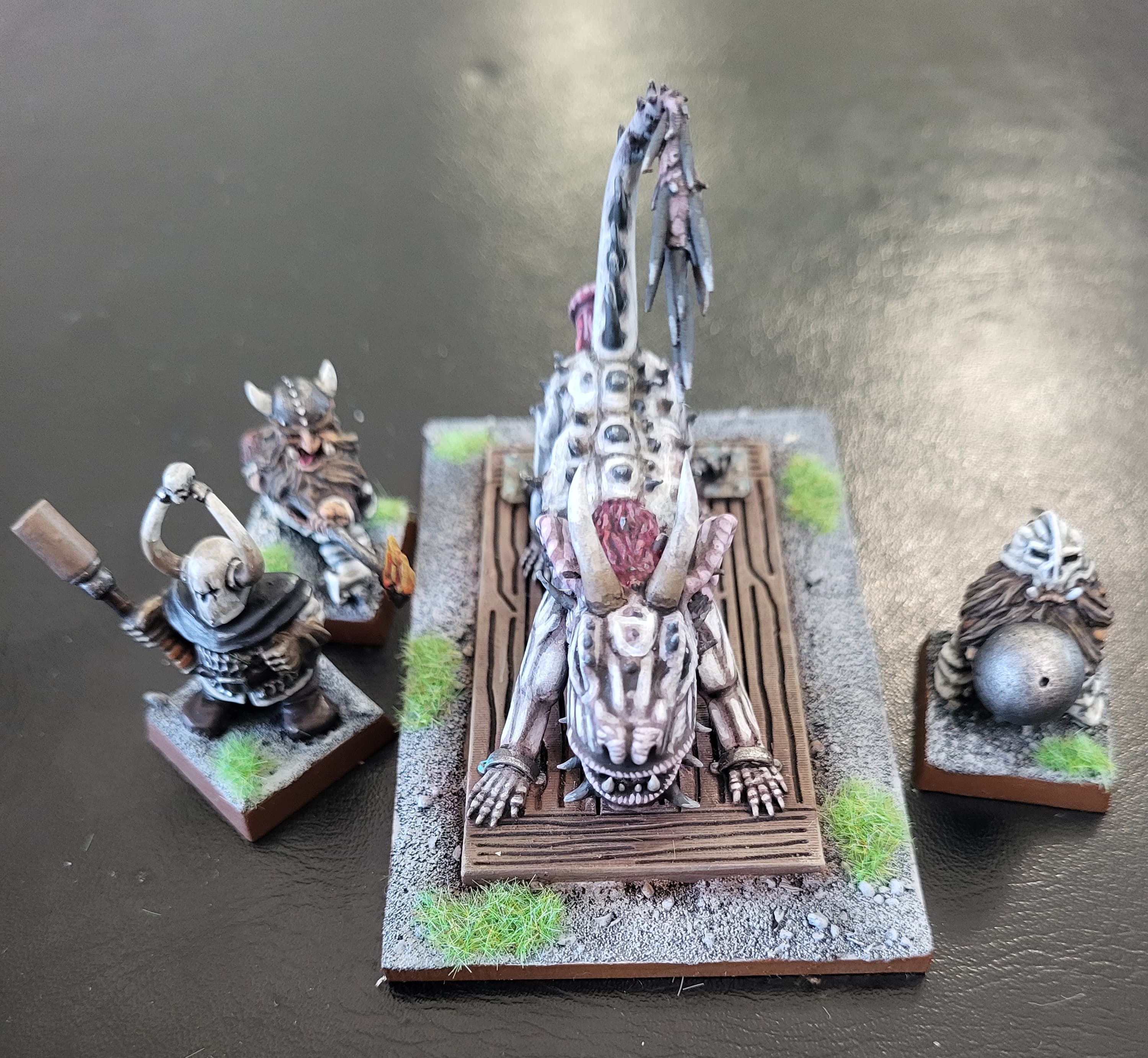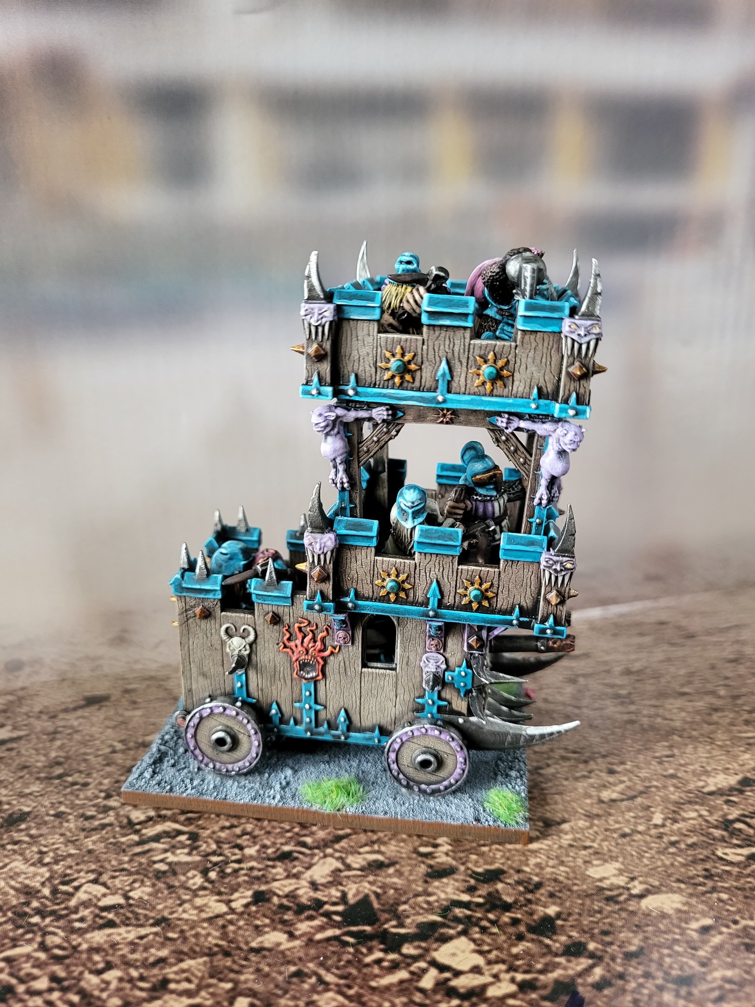 I think there were 2 options for wheels and the sculptor recommended the larger ones. The little square holes in the top level didn’t quite line up to the underlying supports. Getting the centaur in meant i had to paint it separately then squeeze it through the bottom of the juggernaut. I removed thd tab from its feet and glued it and the juggernaut to the base at the same time, while holding them from the top. A bit stressful!